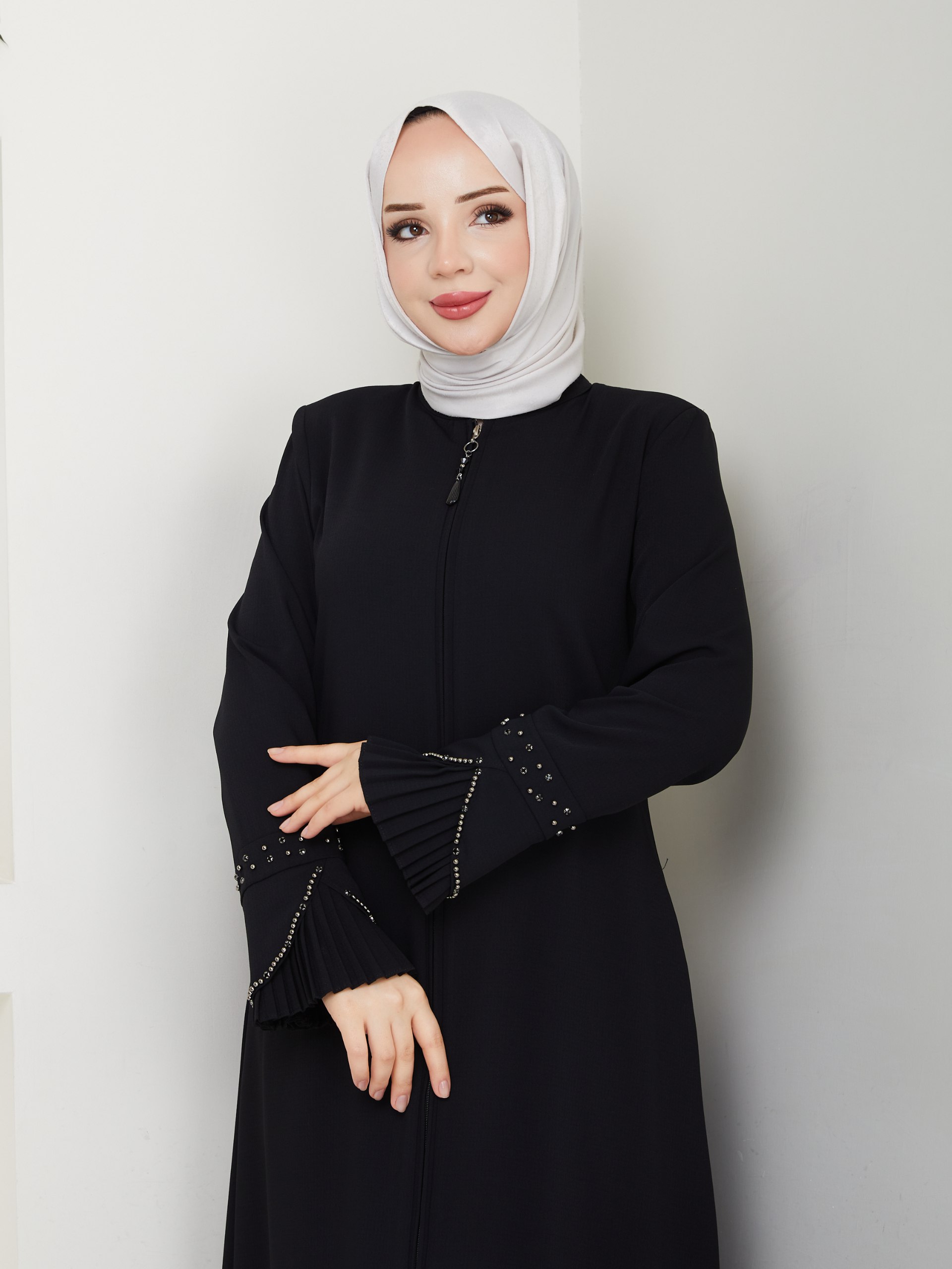 143 cm boy ölçüsüyle rahat bir kullanım sunar.; -Siyah rengi ile asaleti ve zamansız şıklığıyla her stile güçlü bir dokunuş katar.; (Ürün renginde konsept çekimlerinden dolayı ton farklılığı olabilir) – Zarif tasarımıyla dikkat çeken bu ferace, inci detayları ve büzgülü fırfır kol kesimiyle feminen bir görünüm sunar.; – Tam fermuar kapama özelliği sayesinde pratik kullanım sağlar ve rahatlıkla giyilip çıkarılabilir.; – Yüksek kaliteli pamuk polyester karışımından üretilmiş kumaşı ile gün boyu konforlu bir deneyim yaşatır.; – Düz dokuma yapısı, sade ve şık bir siluet oluşturarak her türlü kombinle uyum sağlar.; – 40 derecede ılık suda yıkanabilme özelliği, bakımı kolay ve uzun ömürlü kullanım vaat eder.; – Regular kalıp ile vücut hatlarınıza uygun rahatlıkta bir oturuş sunarken, astarsız yapısı hafifliği ön plana çıkarır.; – Fashion forward persona’ya sahip bu ferace ile günlük giyimde stil sahibi görünümünüzü koruyabilirsiniz.; – İnce kalınlığı sayesinde yaz aylarında serin tutarak konforlu bir kullanım imkanı tanır.; – Uzun kol boyu mevsimsel geçişlerde ideal koruma sağlar.; – Mankenin Üzerindeki 42 Bedendir.; – Manken Ölçüleri: Boy : 168 cm Göğüs : 94 cm Bel : 70 cm Basen : 96 cm Kilo: 60 Her beden ölçüsü bir öncekinden 2-3 cm büyüyerek artmaktadır.; (Ürün boyu değişmez)